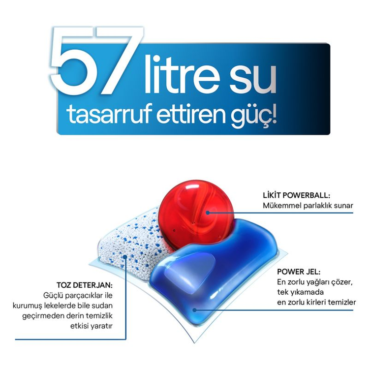 این محصول از ۳ قسمت پودر، ژل و پاوربال تشکیل شده و بکار گرفتن این تکنولوژی سبب چند برابر شدن قدرت پاکسازی و براق کنندگی آن شده است. ژل آن هنگام چرخه آبکشی تمام مواد مورد نیاز برای تمیز کردن و چربی زدایی عمیق ظروف را فعال می کند.